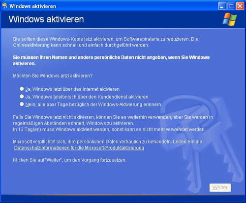 Windows XP über das Internet aktivieren