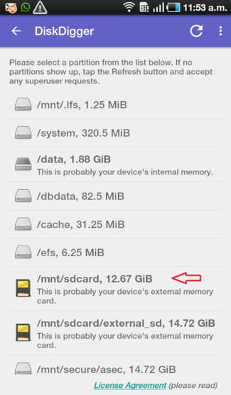 DiskDigger und wählen Sie die Partition aus, auf der die Fotos oder Videos abgelegt waren, bevor sie gelöscht wurden. Fehler in der Anwendung können zur Folge haben, dass der interne Speicher als externer erkannt wird. Das ist jedoch nicht weiter schlimm: