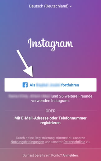 Die Erstellung eines Instagram-Accounts kann auch über Ihr Facebook-Konto erfolgen. Tippen Sie nach der Installation der App einfach auf